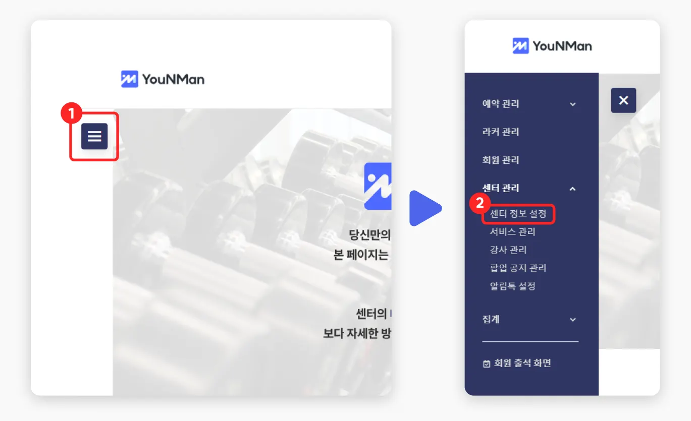 좌측상단 ☰ 버튼 클릭 → 센터 정보 설정 클릭
