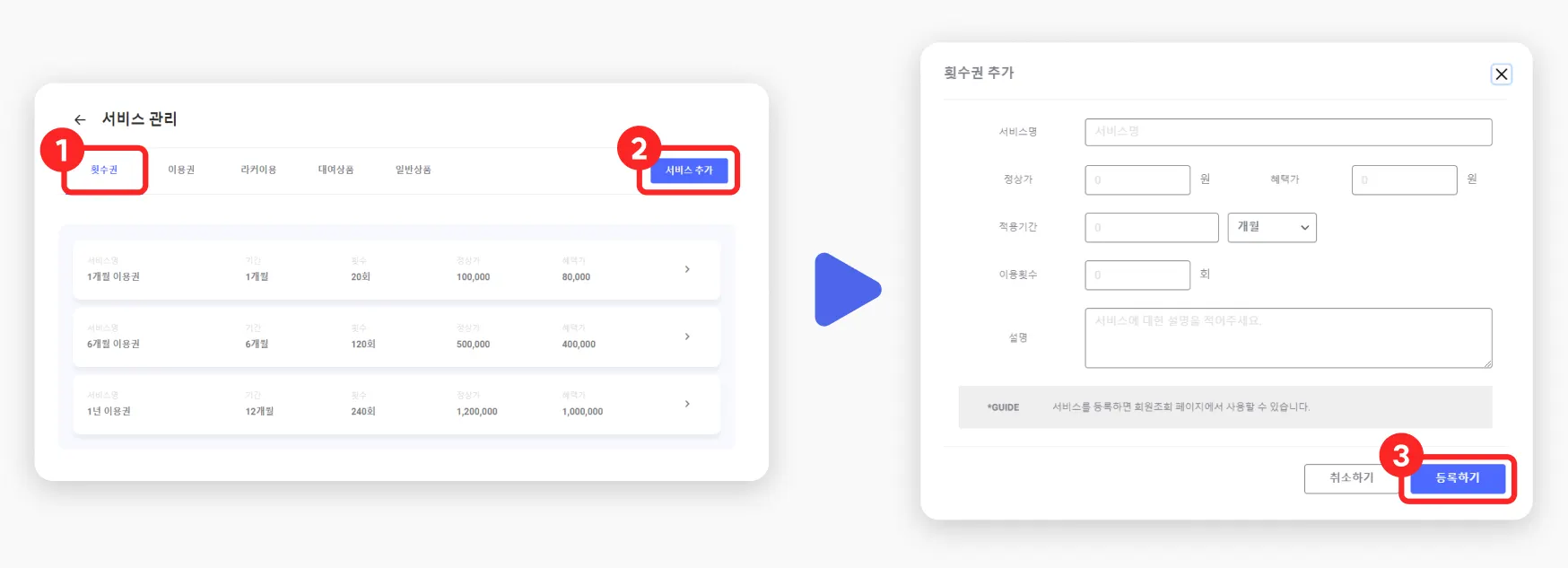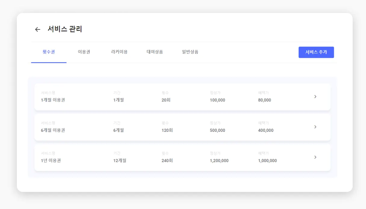 횟수권과 더불어 이용권 /라커이용 / 대여상품 / 일반상품도 추가할 수 있습니다. 자세한 방법은 상세가이드 “서비스 관리 / 강사 관리 / 팝업 공지” 편의 “1-3, 1-4, 1-5, 1-6”을 참고해주세요