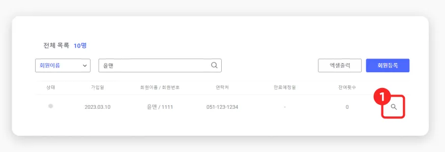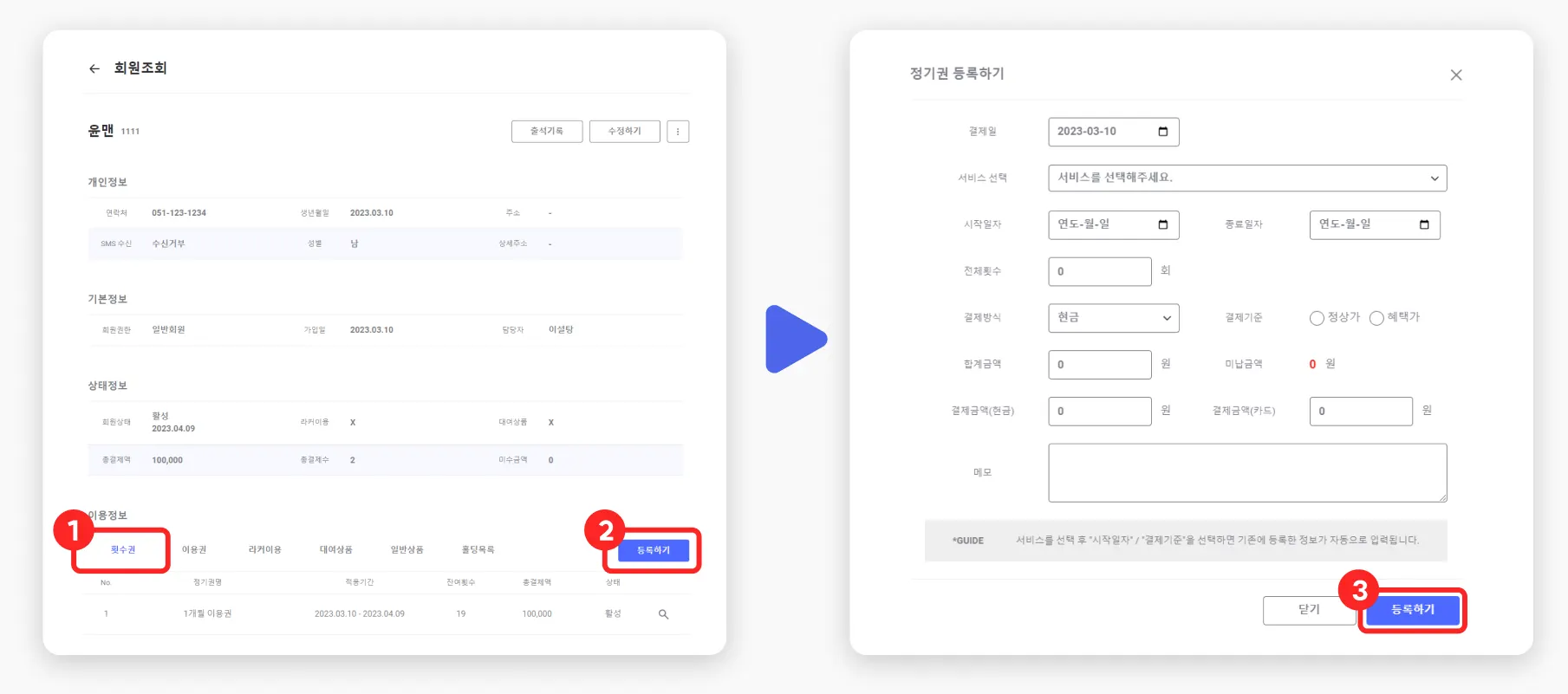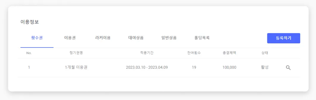 횟수권 등록하기 창에서 정보 입력 후 등록하기 버튼 클릭