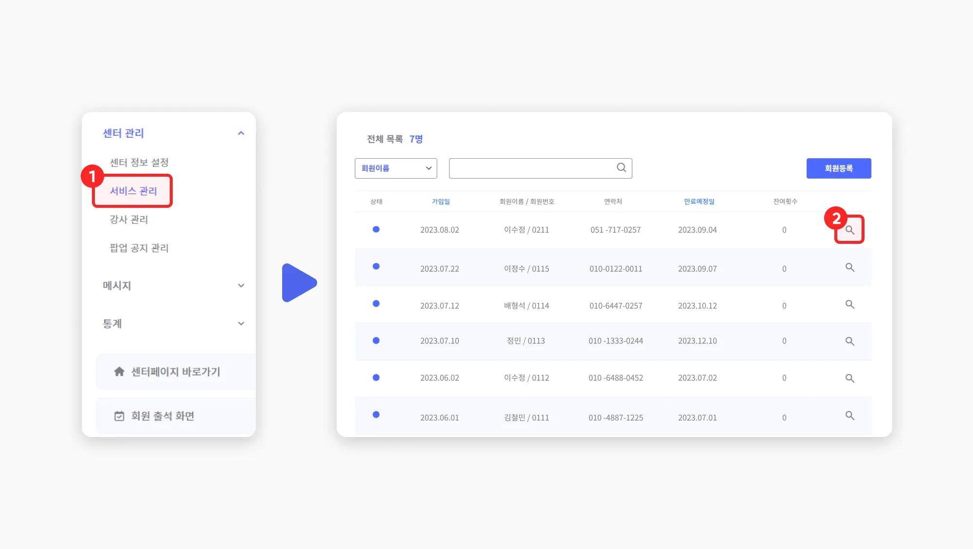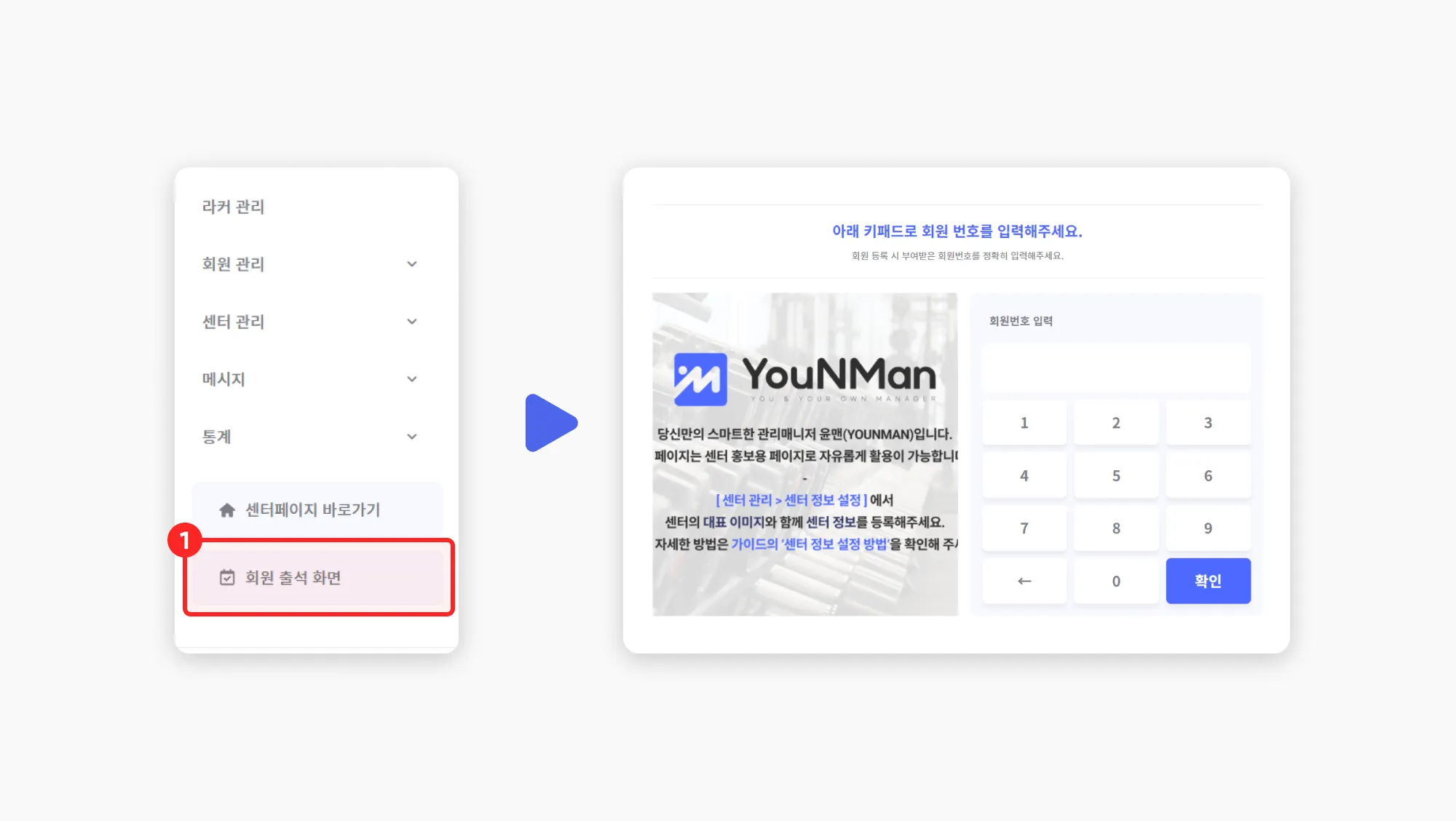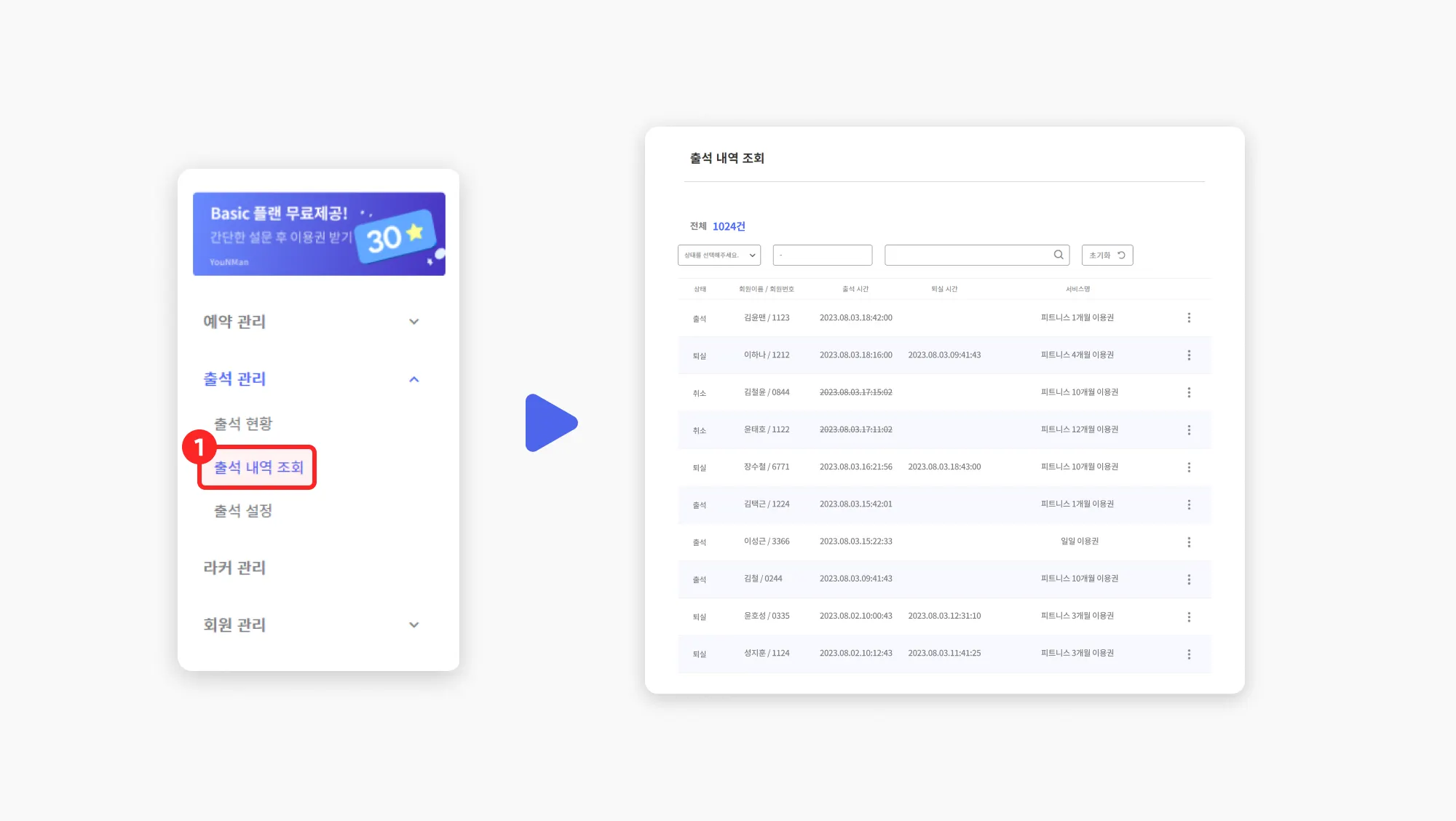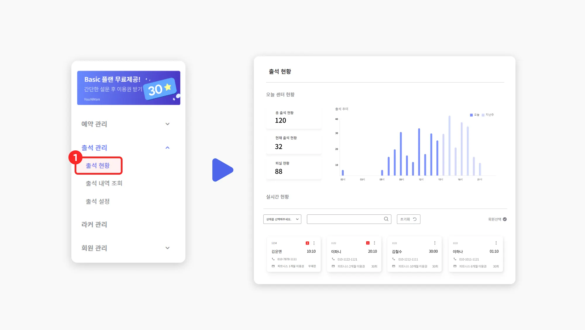 1. 좌측 메뉴에서 회원 출석 화면 클릭