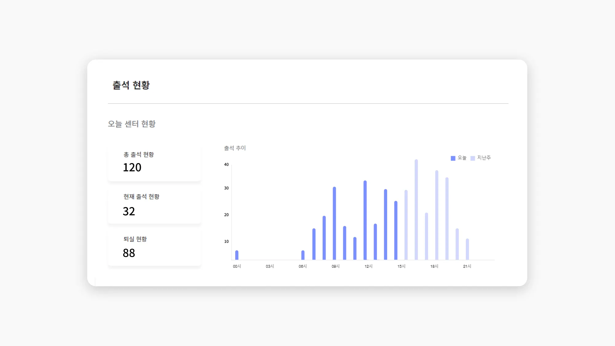 오늘 센터 현황에서초 당일 출석 현황을 확인 할 수 있습니다.