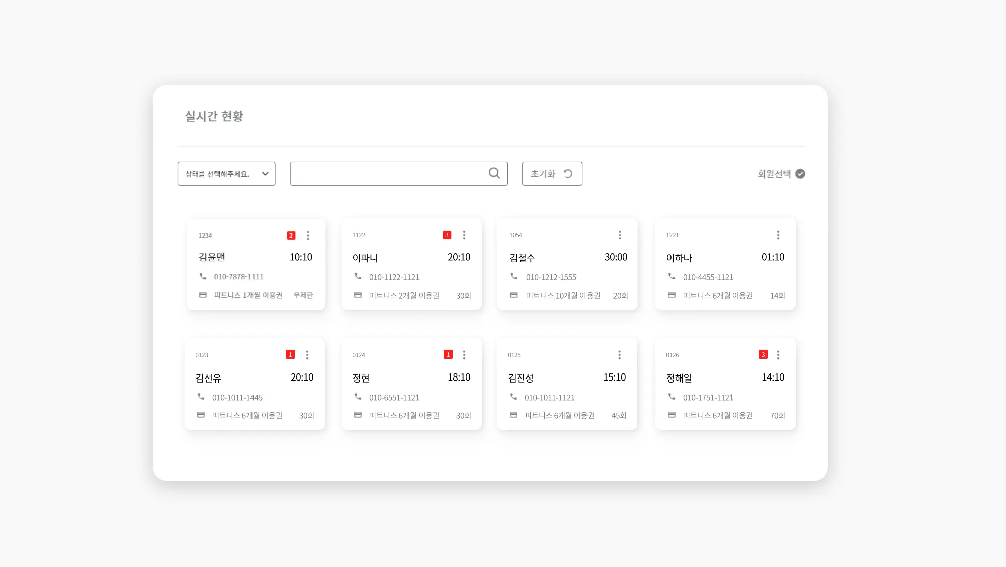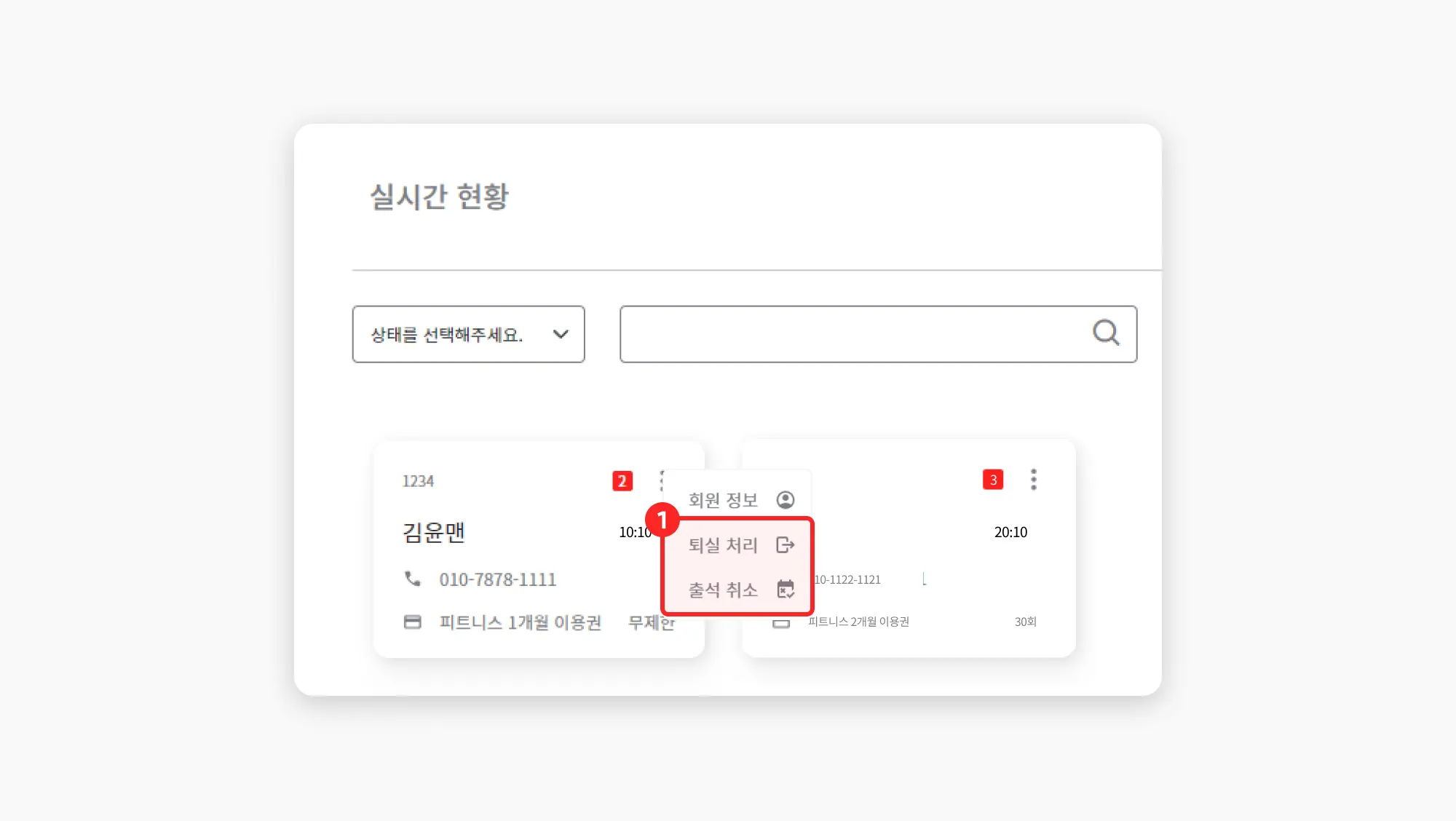 1. 검색을 통해 실시간 출석 정보를 상태별, 회원정보별 검색이 가능합니다.