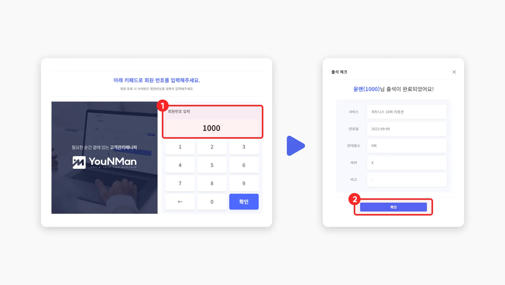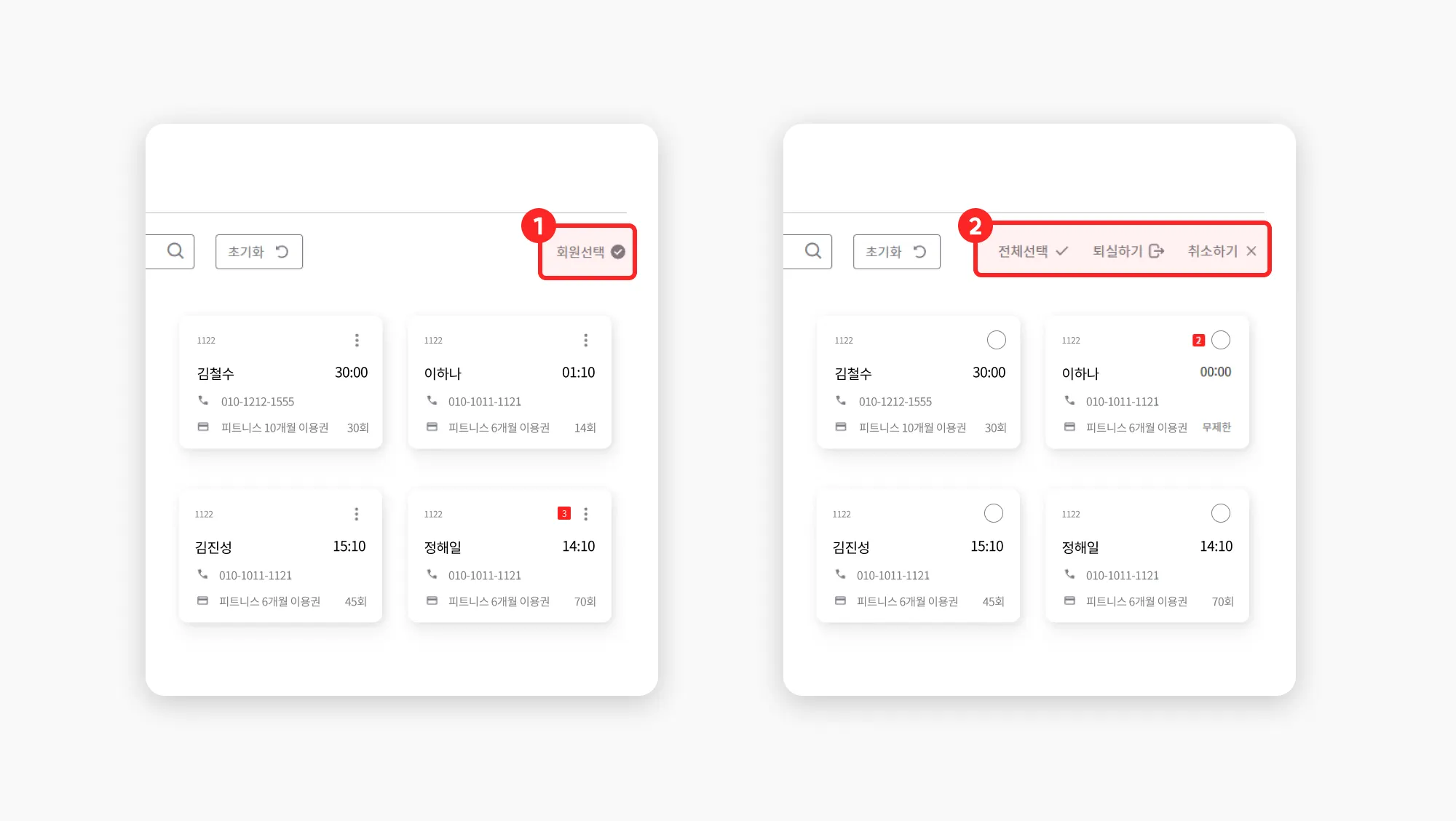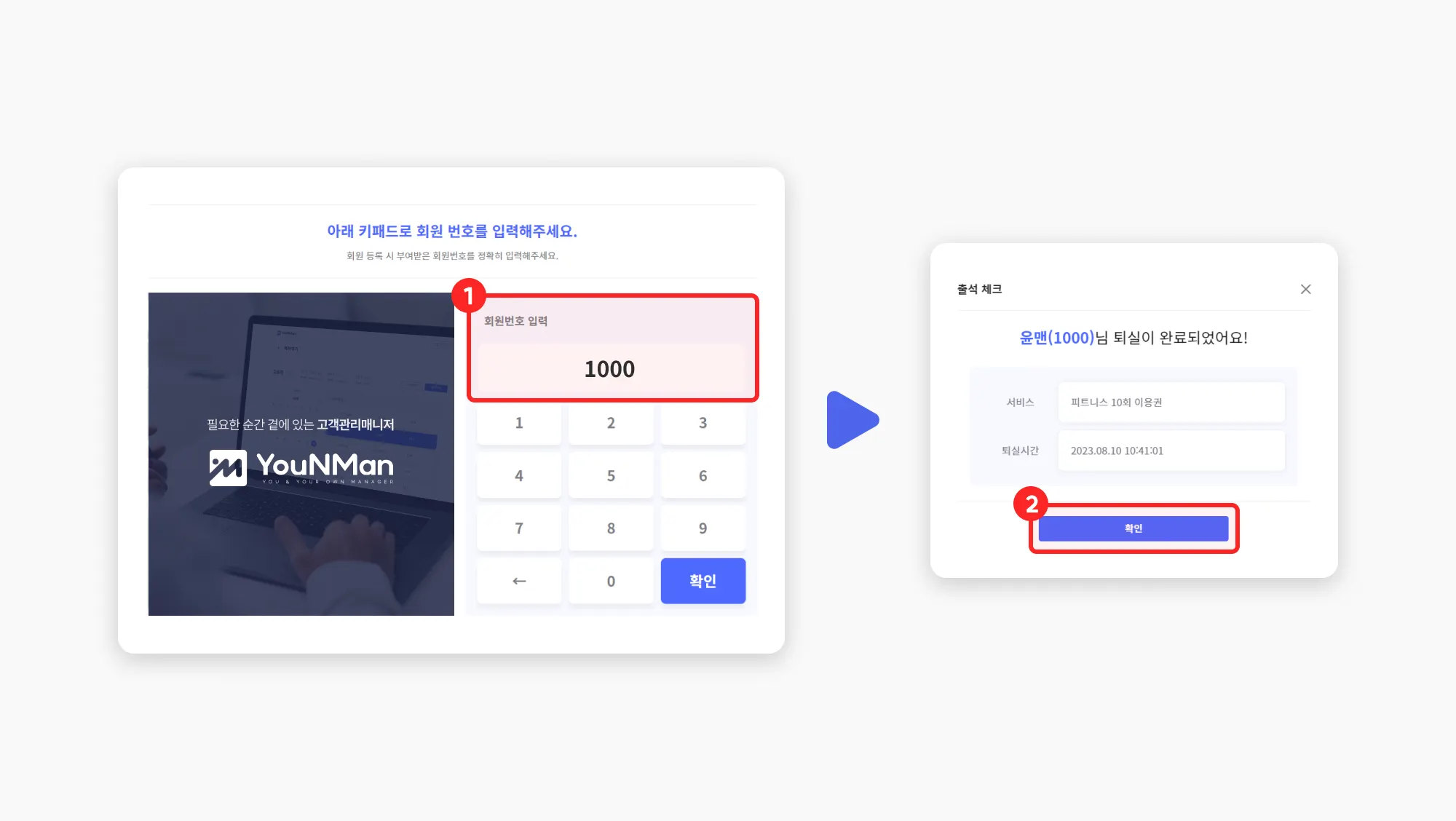 퇴실은 출석이 등록된 후 회원번호를 재입력 해야 등록이됩니다.