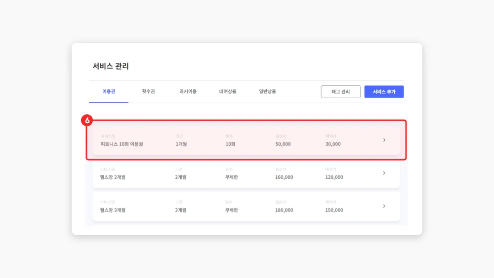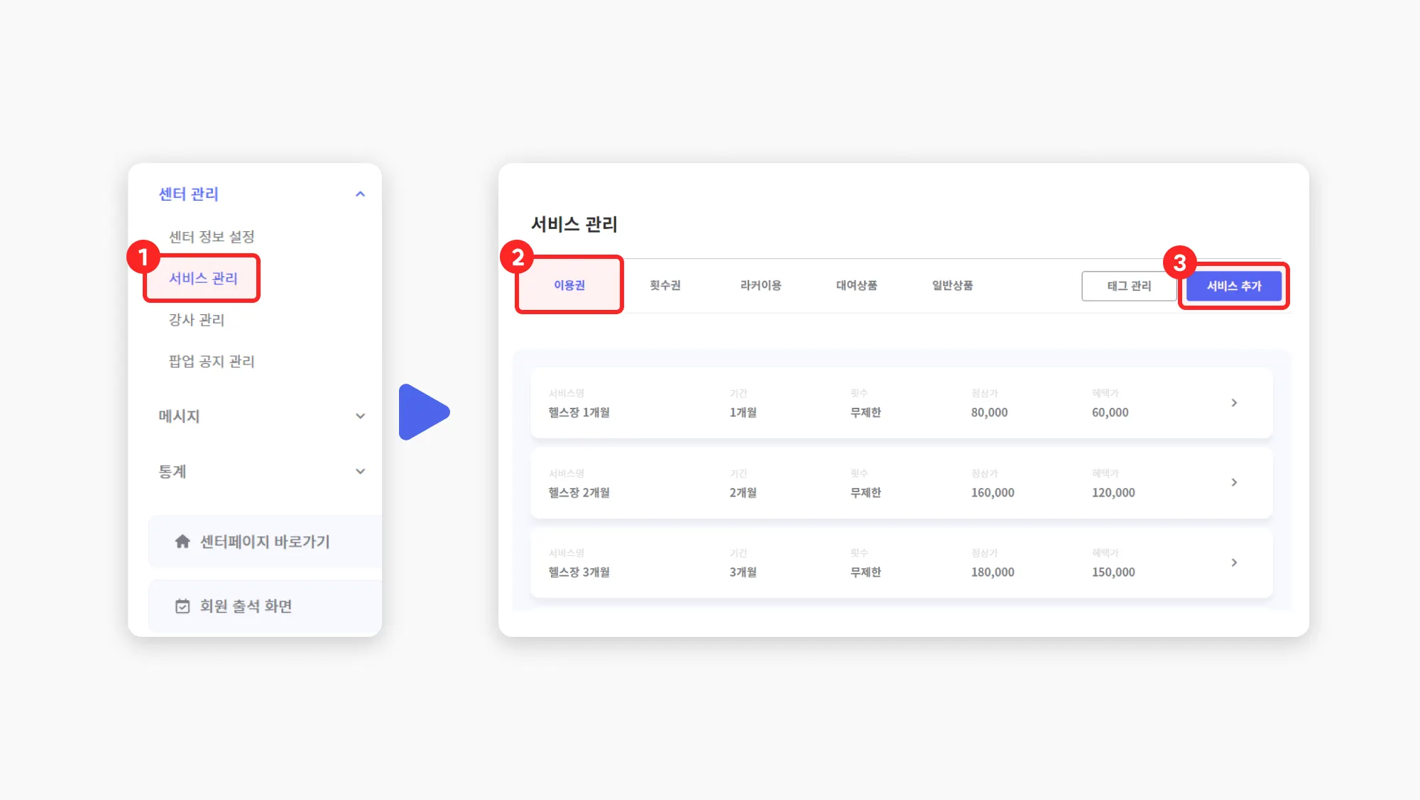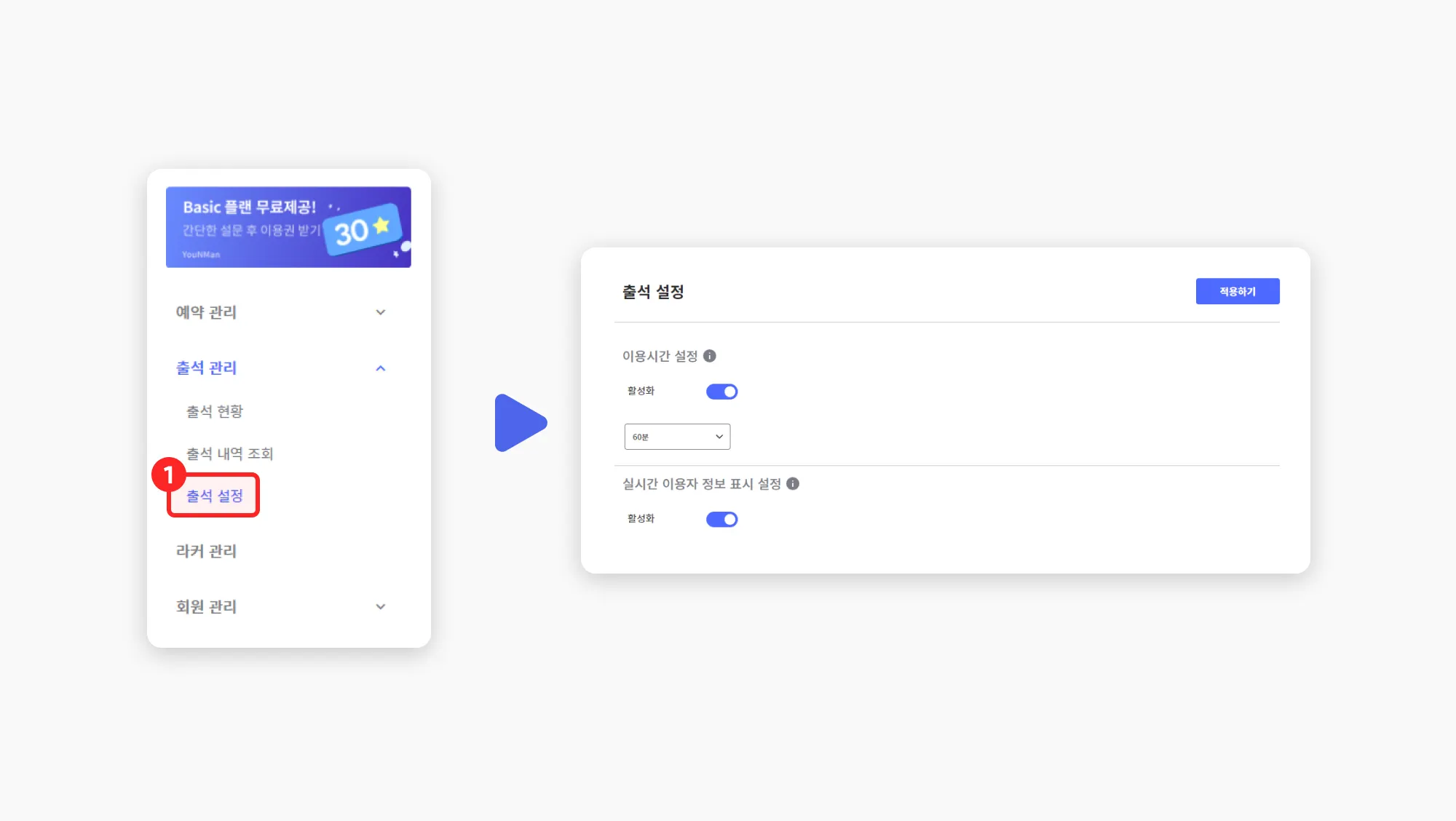 출석 이용을 할 수 있는 이용권 등록 및 회원에게 적용시키는 방법입니다.