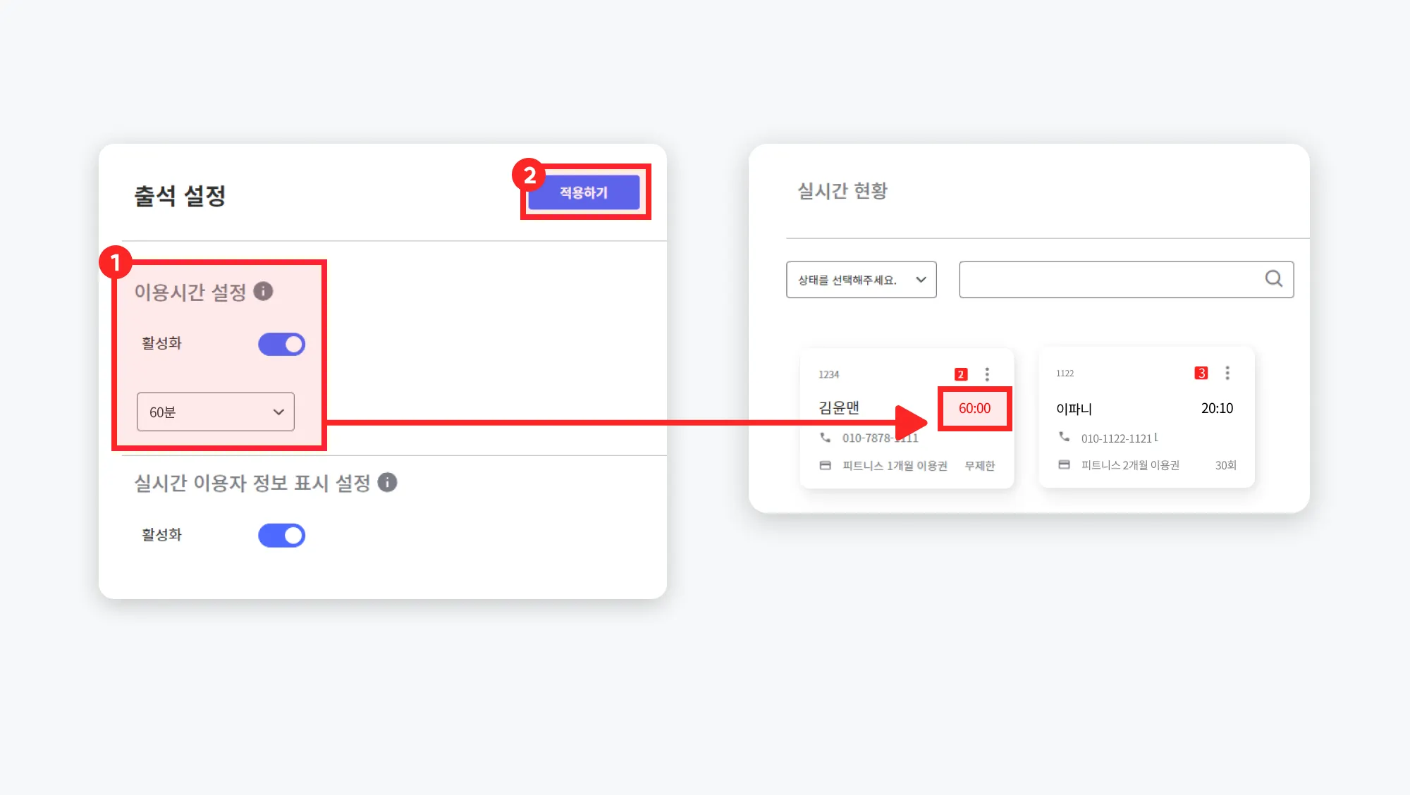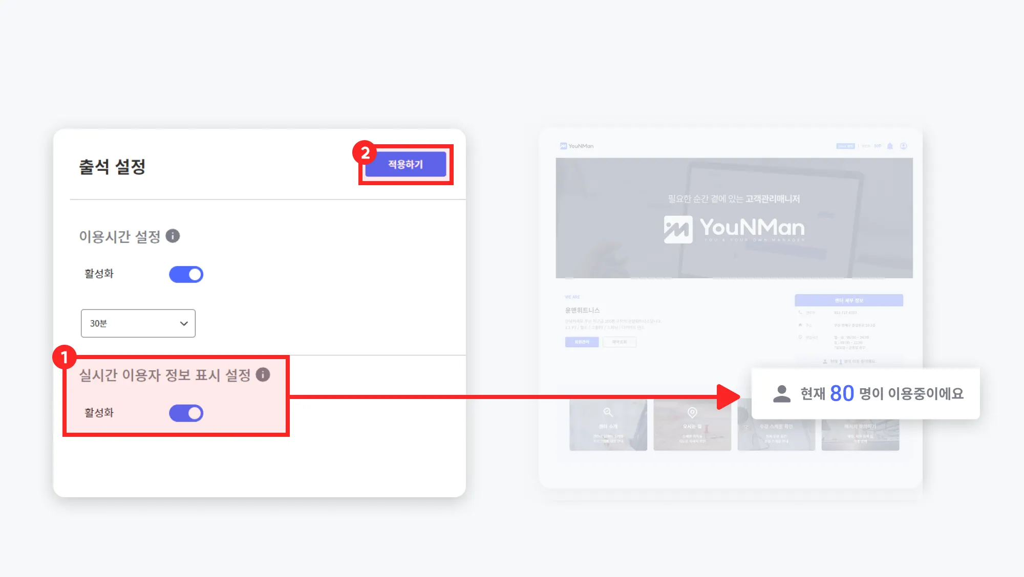 이용시간 및 실시간 이용자 정보 표시를 설정할 수 있는 방법입니다.