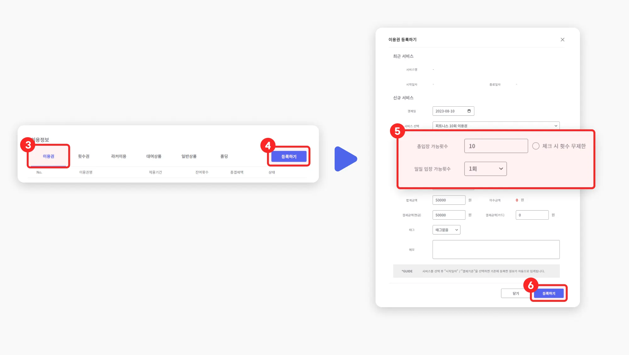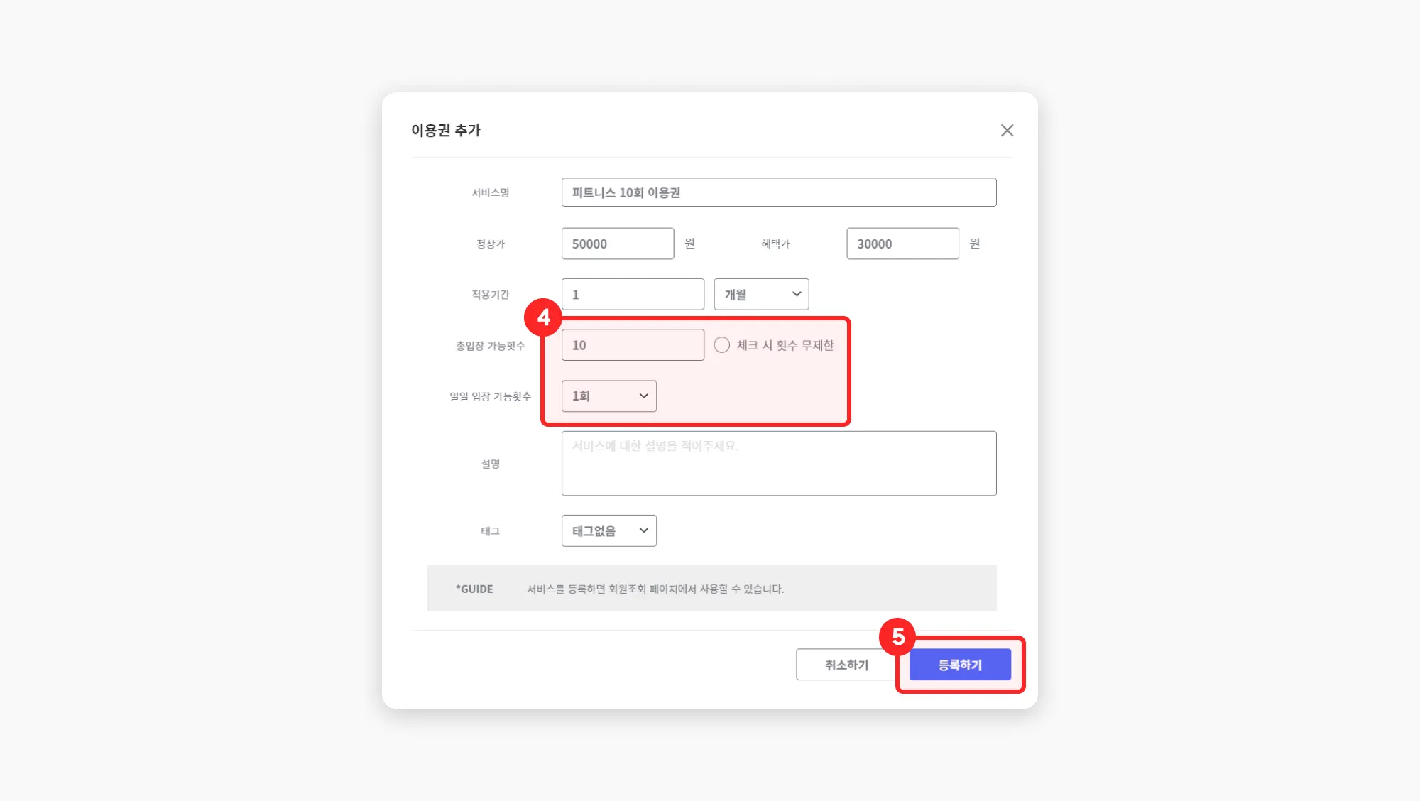 2. 이용권 등록하기창에서도 총입장 가능횟수 및 일일 입장 가능횟수 설정이 가능합니다.