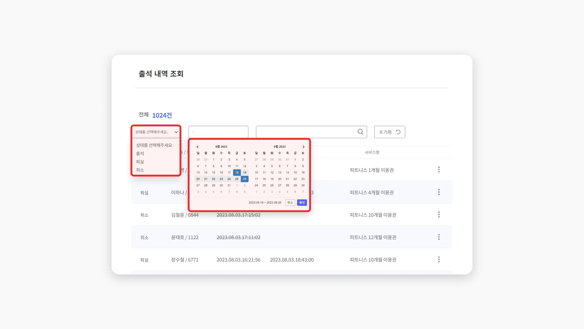 필터를 통해 상태별, 날짜별, 회원이름/회원번호별로 출석 내역을 검색할 수 있습니다.