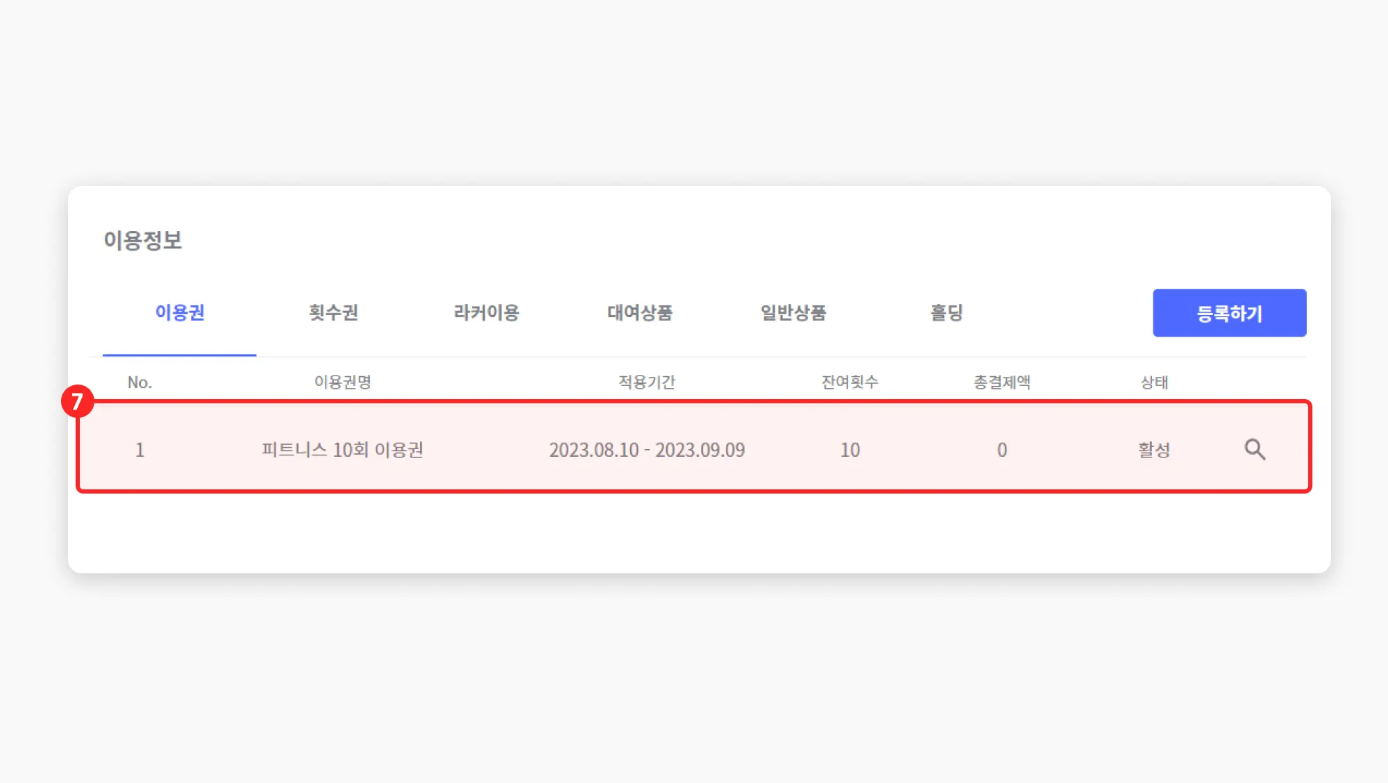 이용정보 영역에서 이용권 탭 클릭 후 등록하기 버튼 클릭