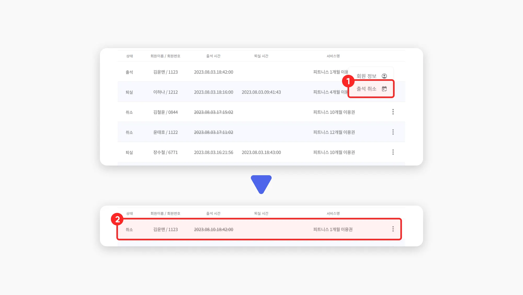 1.취소된 내용은 상태가 취소로 변경되며 출석 시간이 취소선으로 표시가 됩니다.