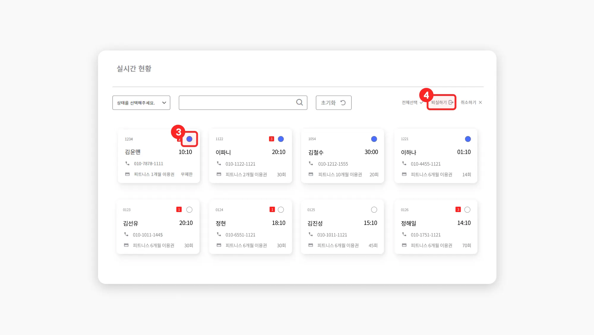 설정된 시간을 기준으로 실시간 현황에서 이용시간이 완료된 출석회원은 이용시간이 붉은색으로 표시됩니다.