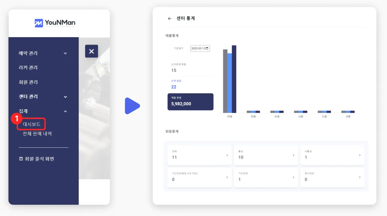 센터 통계 및 회원 통계를 한 눈에 확인 할 수 있는 대시보드 화면 이용에 대한 설명입니다.