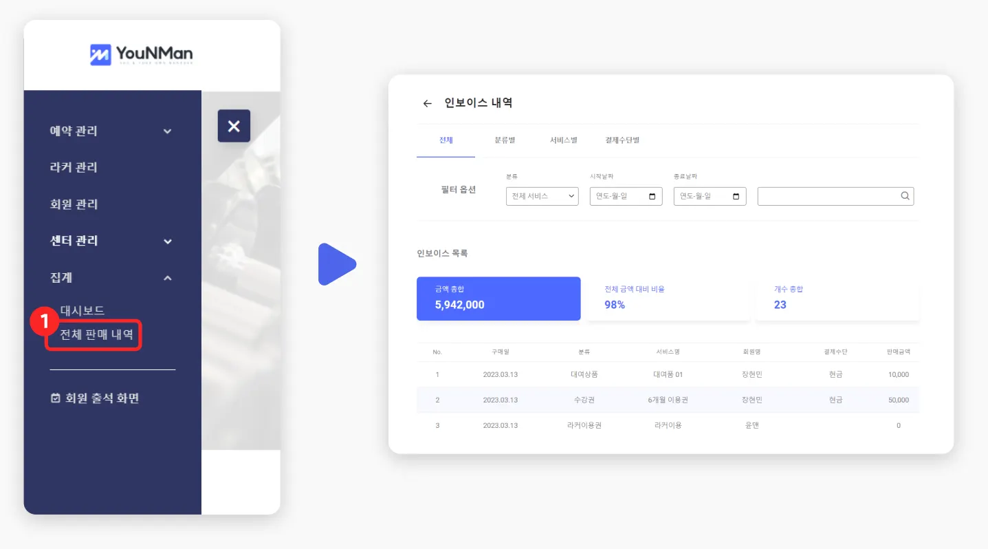 매출 및 회원 수 등 업장에 관한 전반적인 데이터를 확인할 수 있는 통계 이용에 대한 설명입니다.