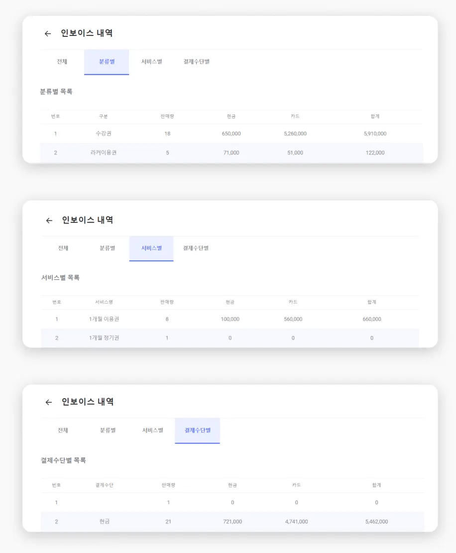각 탭 클릭시 서비스 분류별 / 서비스별 / 결제수단별 통계 조회 가능