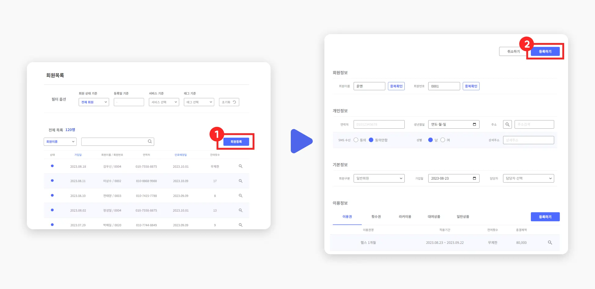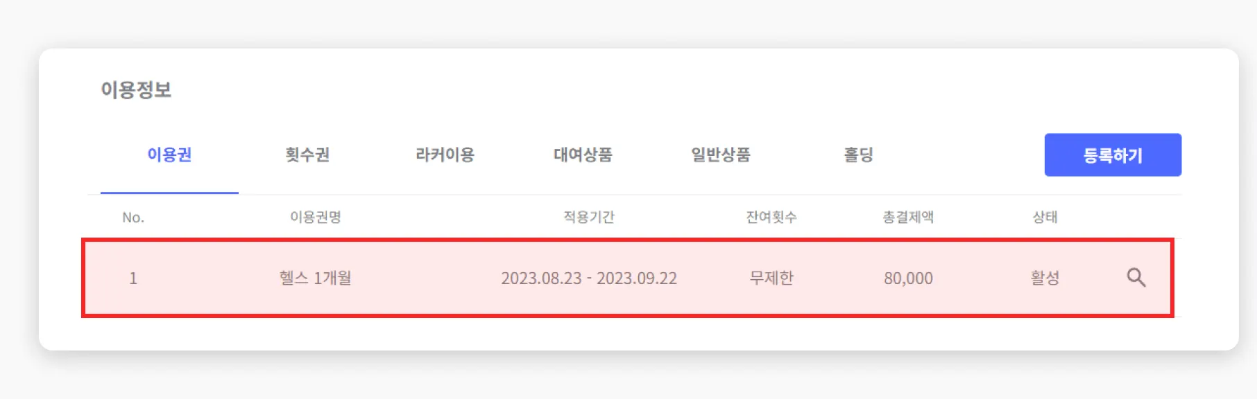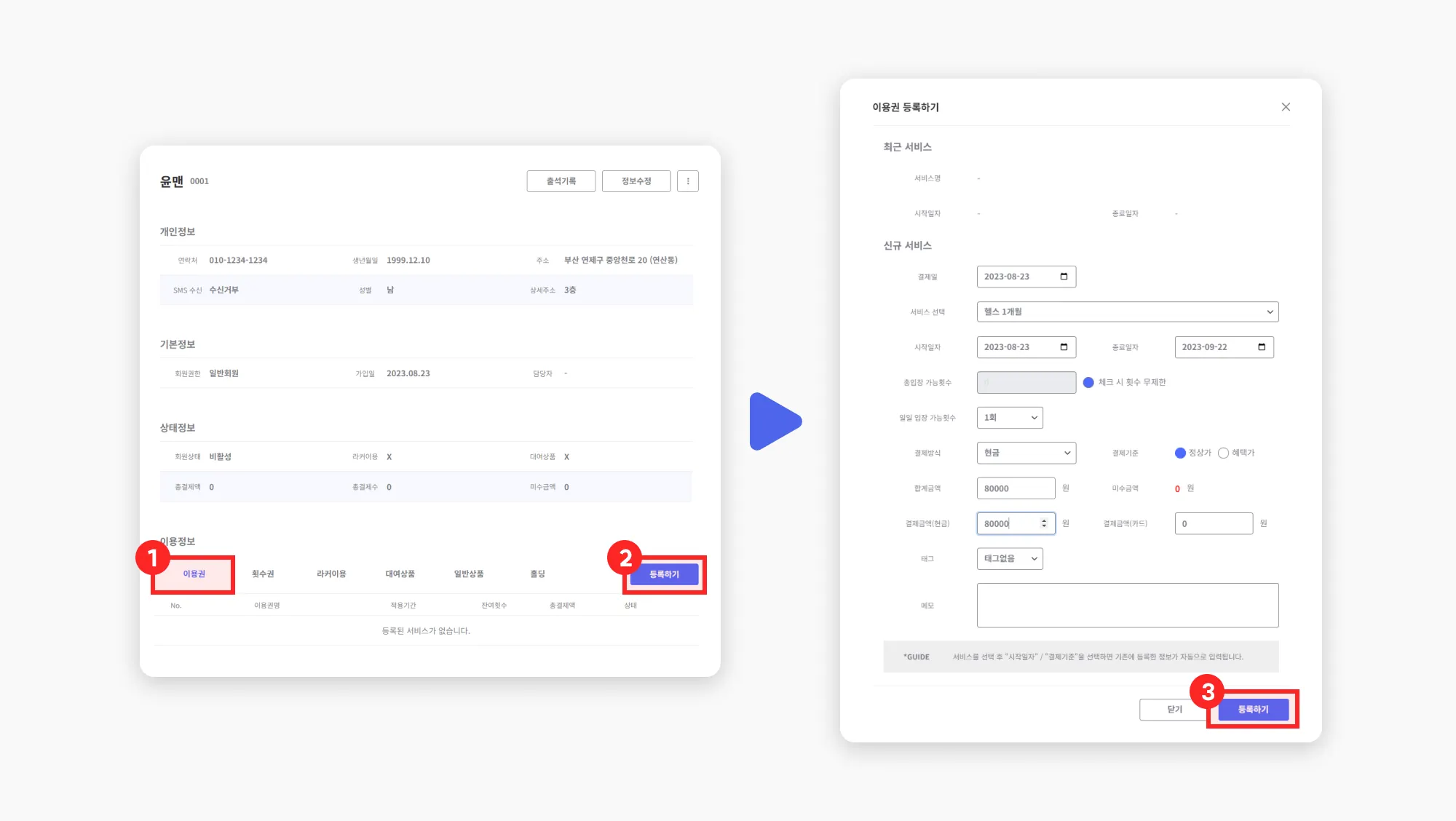 회원 조회 페이지 아래 이용정보 탭에서 등록하기 버튼 클릭