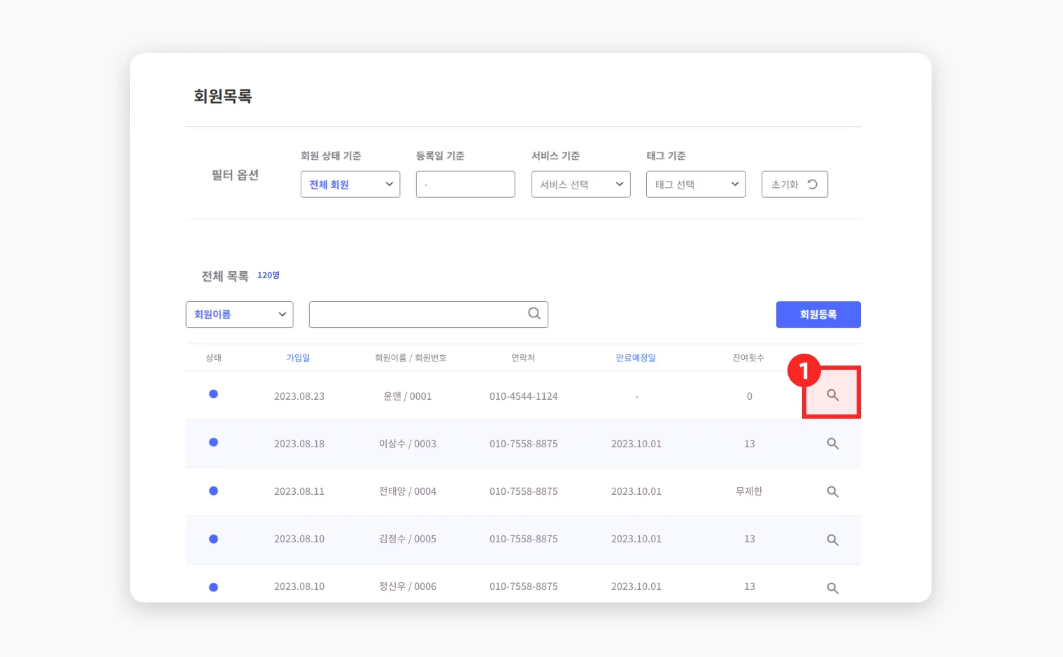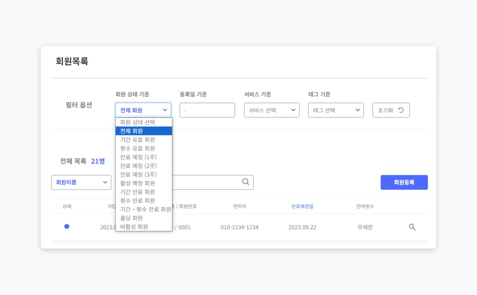 1. 회원 관리페이지 상단 필터 옵션을 통해 회원의 상태별, 등록일 별, 정기권 종류 별 조회 가 가능합니다.