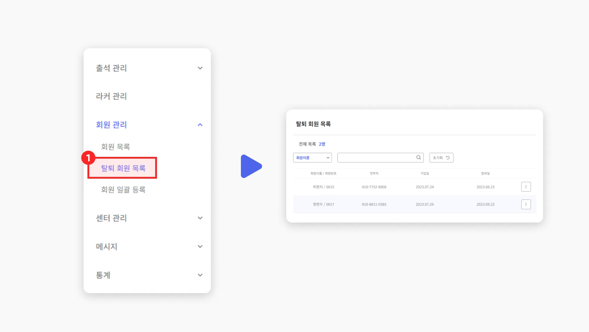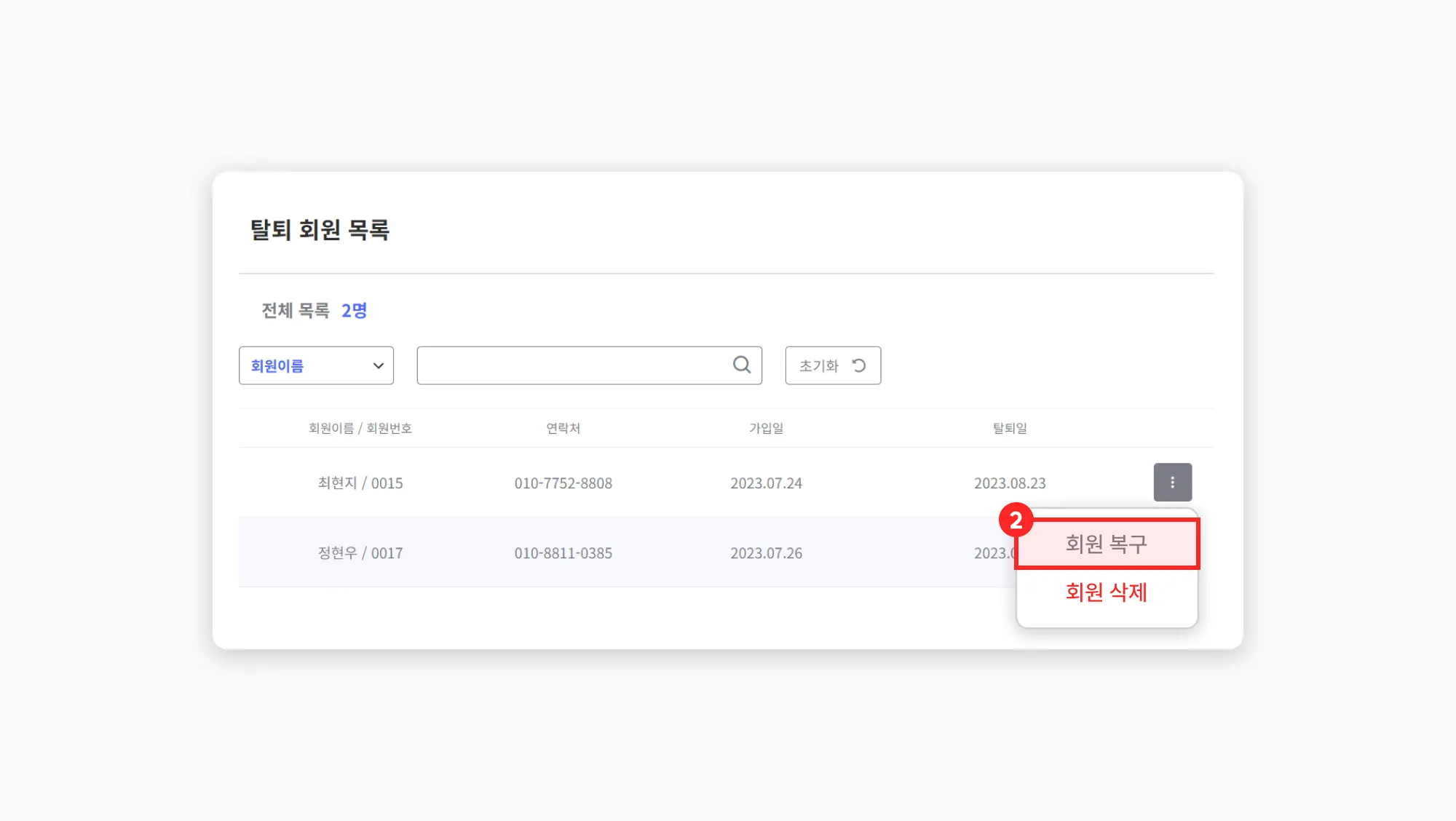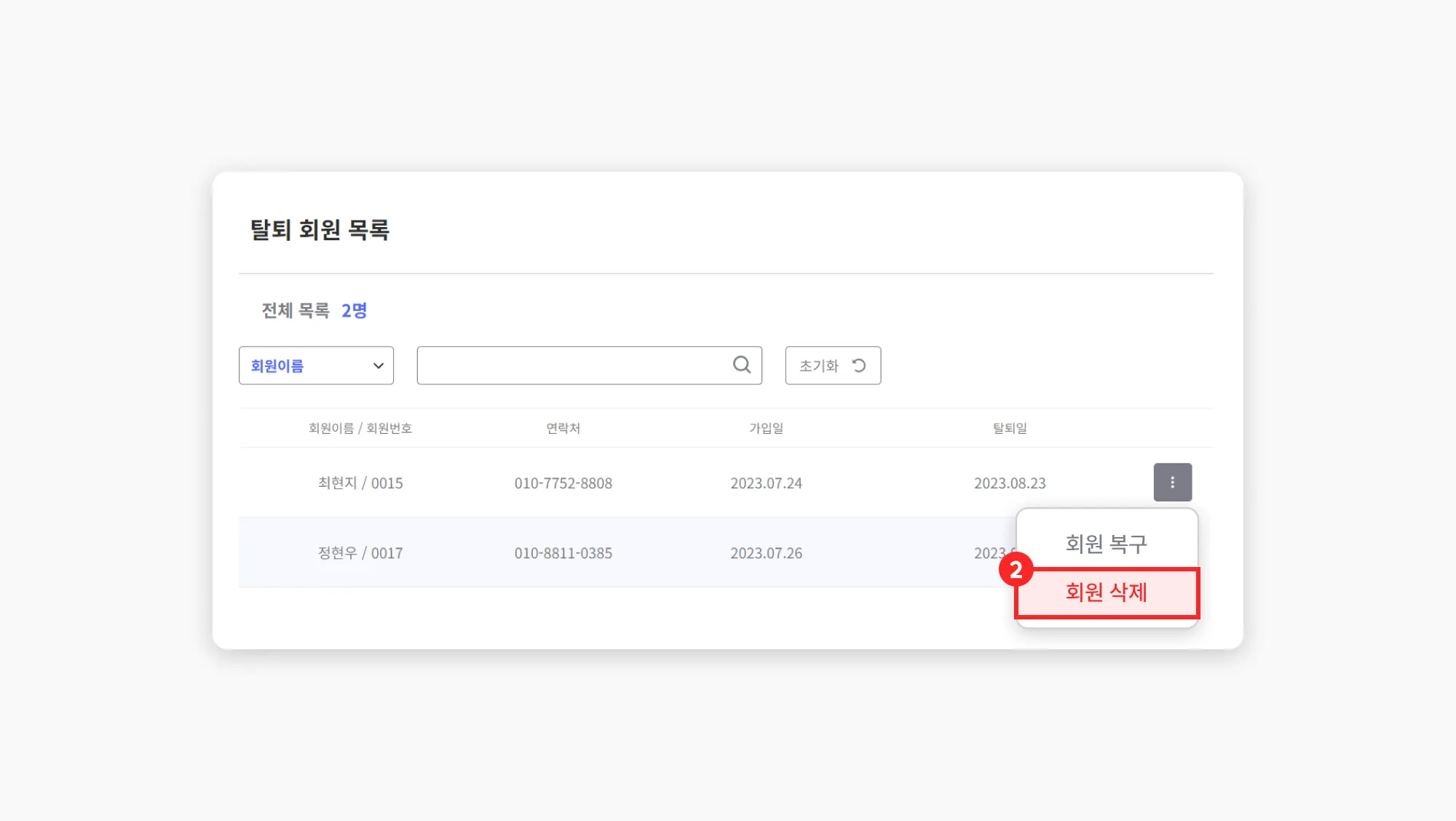 1. 탈퇴 처리된 내용 탈퇴 회원 목록 페이지에서 확인이 가능합니다.