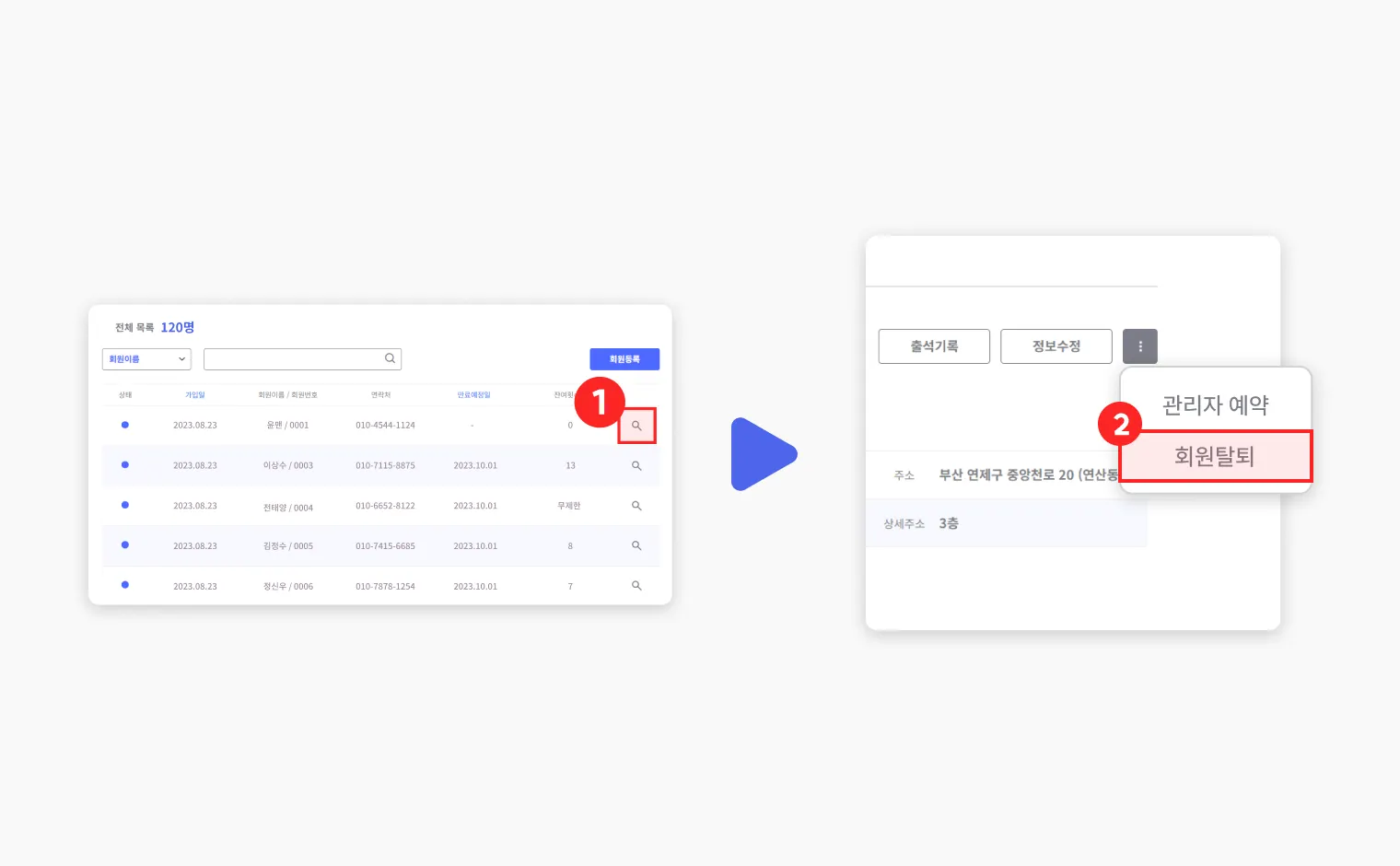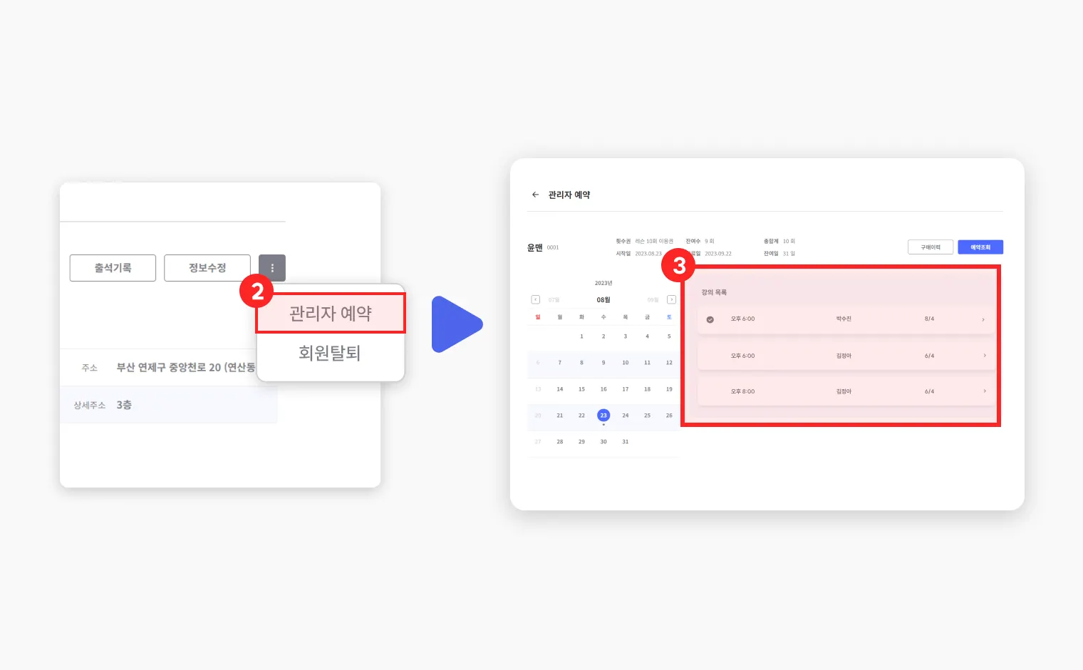 2. 관리자는 해당 회원의 횟수권이 만료되었거나 잔여 횟수가 없어도 예약이 가능합니다.