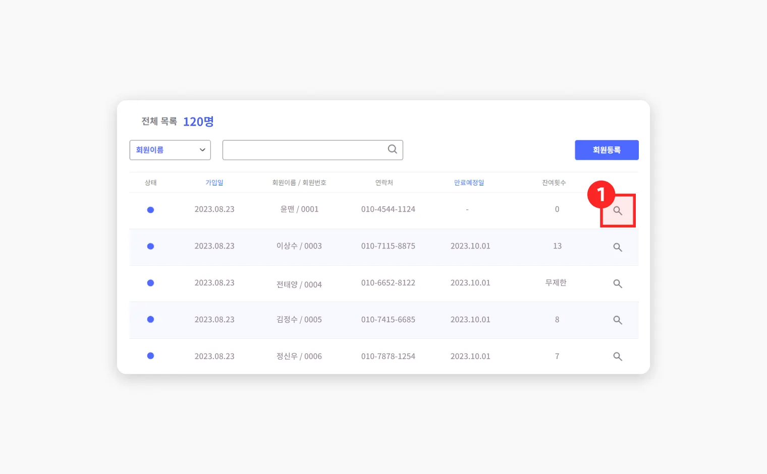 1. 회원 검색 창에 등록할 회원 이름을 입력하면 등록되어 있는 회원 정보가 자동으로 표시됩니다.