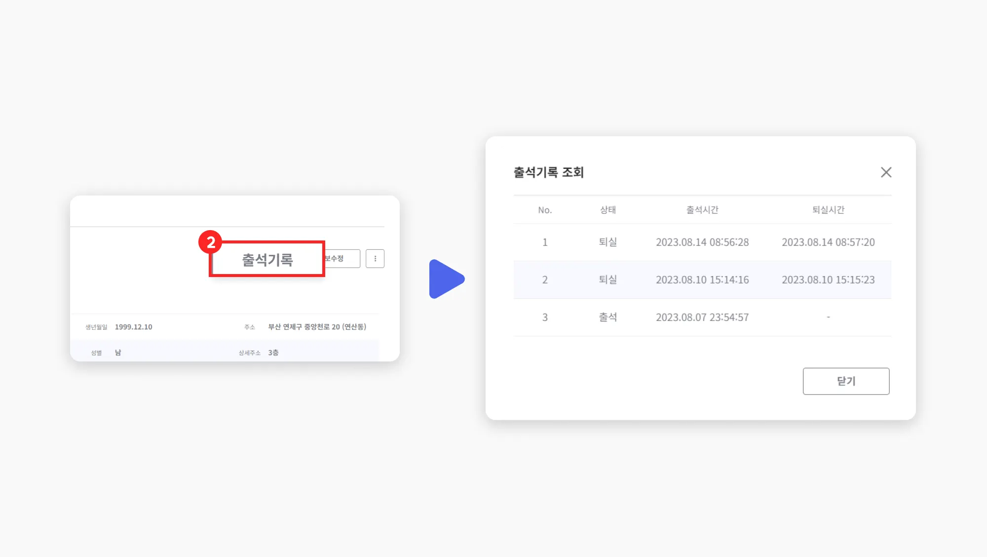 1. 회원관리에서 확인 가능한 출석내역은 회원 개개별 출석 내용입니다.