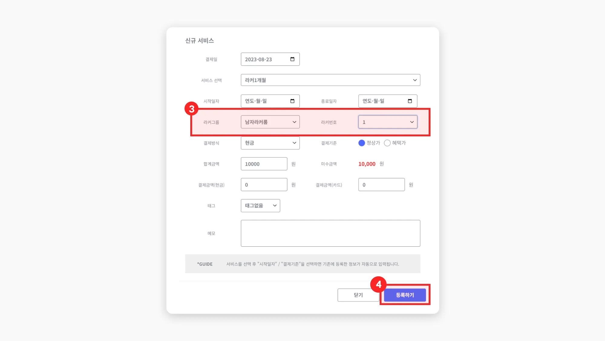 1. 결제일을 선택하고 서비스 선택에서 미리 등록해 놓은 정기권을 선택하면 자동으로 전체횟수, 합계금액이 입력되며, 입력된 정보는 수정이 가능합니다.