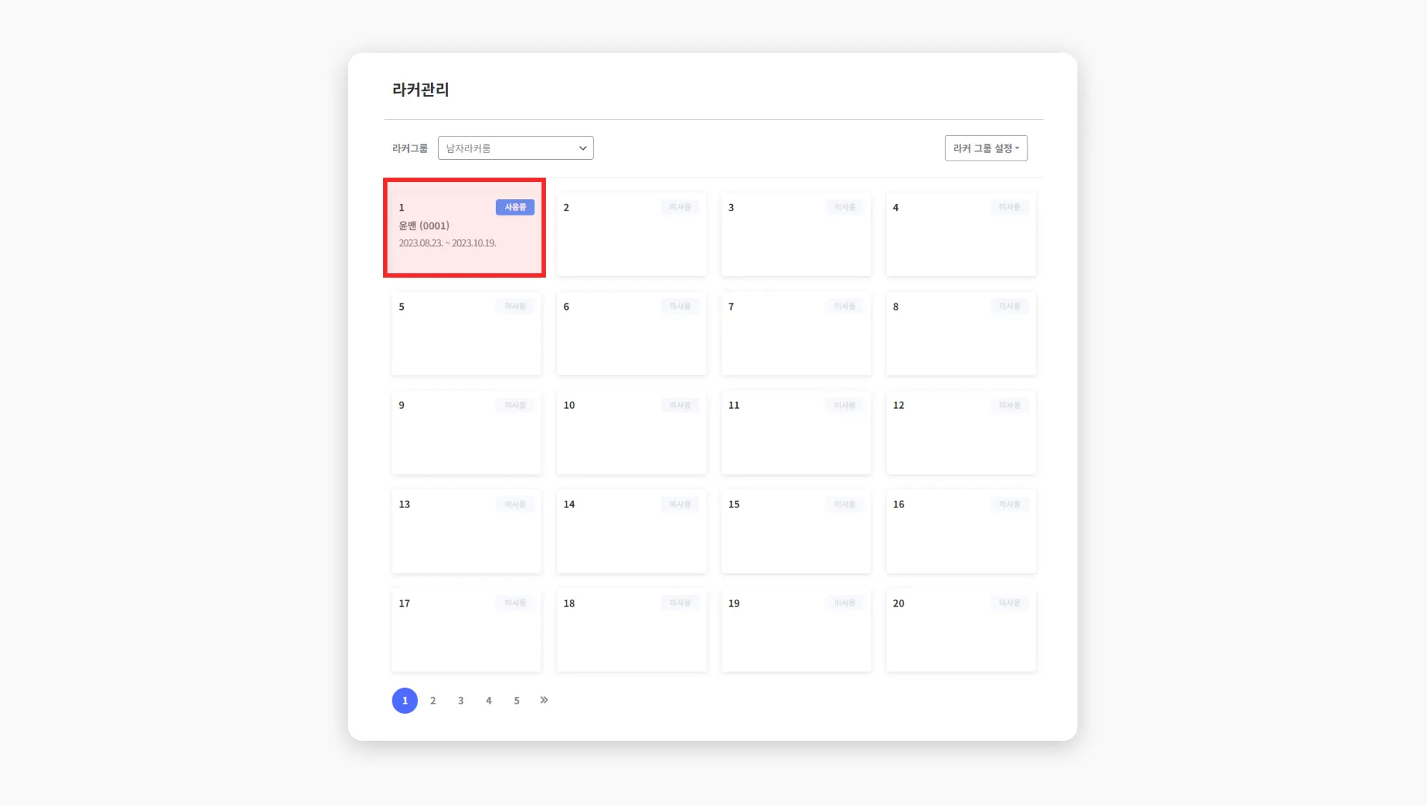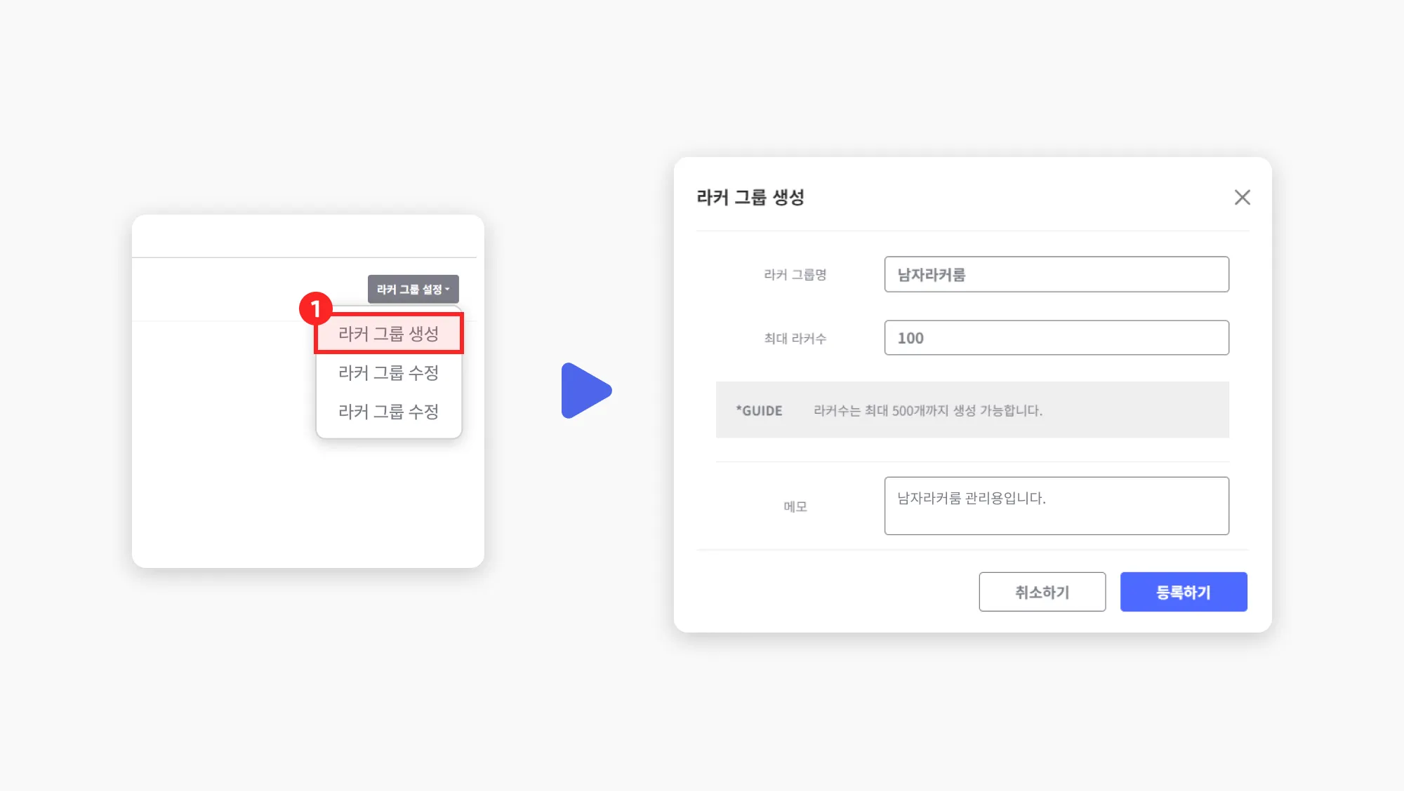 라커 관리 페이지 우측 상단 라커 그룹 설정 탭에서 라커 그룹 생성 클릭